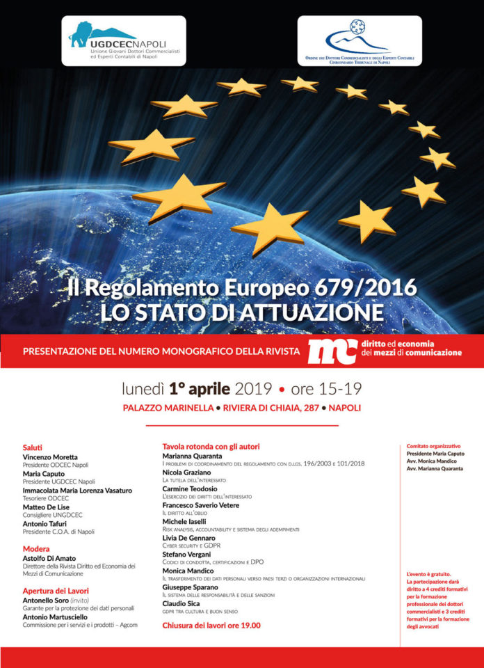 Il 1 aprile 2019, alle ore 15.00, in Napoli presso Palazzo Marinella, a via Riviera di Chiaia, 287 si terrà l’evento di presentazione del numero monografico della rivista “Diritto ed Economia dei Mezzi di Comunicazione” edito dalla società CCE – Centro Consulenze Editoriali, dedicato al Regolamento Europeo n.679/2016, relativo alla protezione delle persone fisiche con riguardo al trattamento dei dati personali, nonché alla libera circolazione di tali dati e che abroga la direttiva 95/46/CE e sul relativo stato di attuazione.